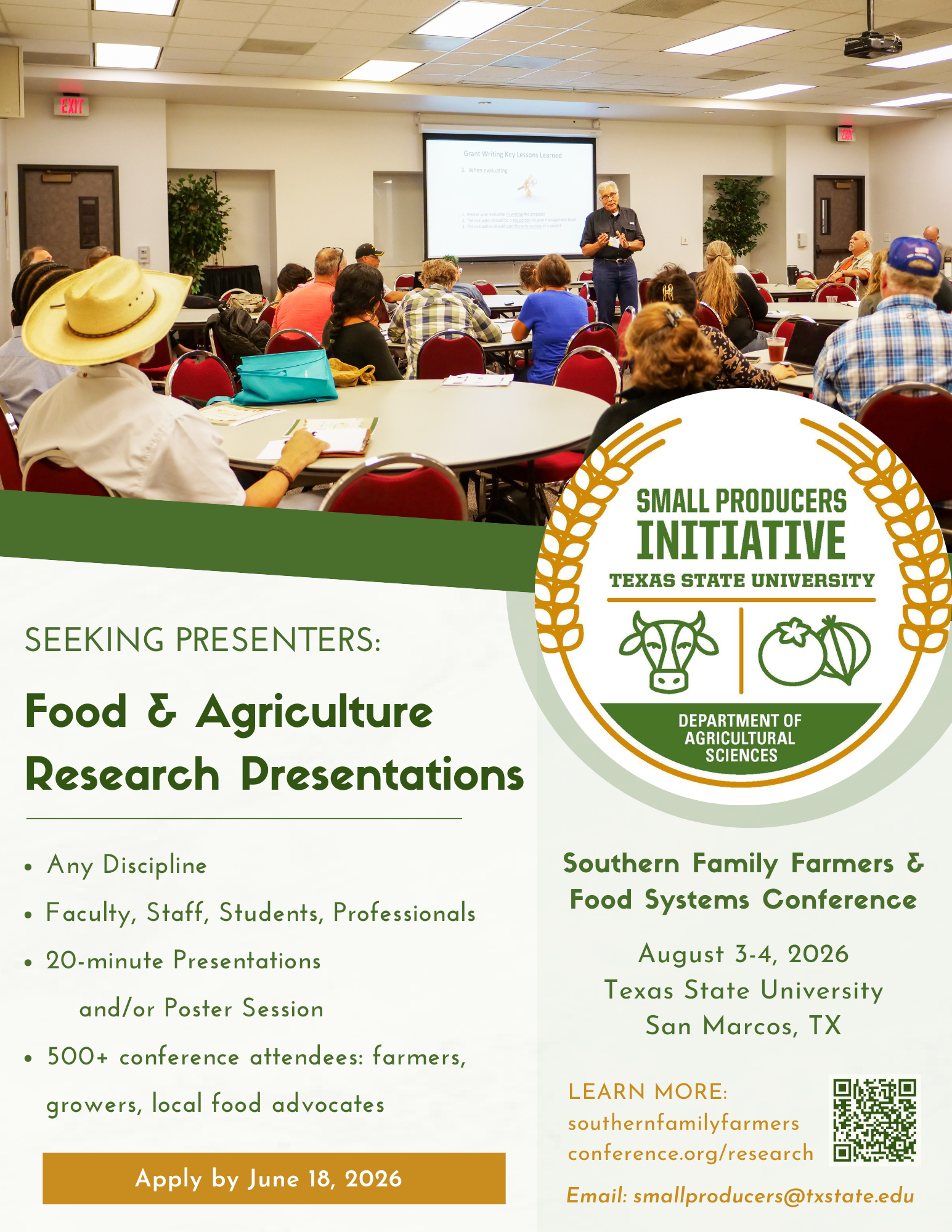 The Small Producers Initiative is hosting a research track and poster session at the Southern Family Farmers & Food Systems Conference at Texas State University on Monday Aug 3 - Tuesday Aug 4th.